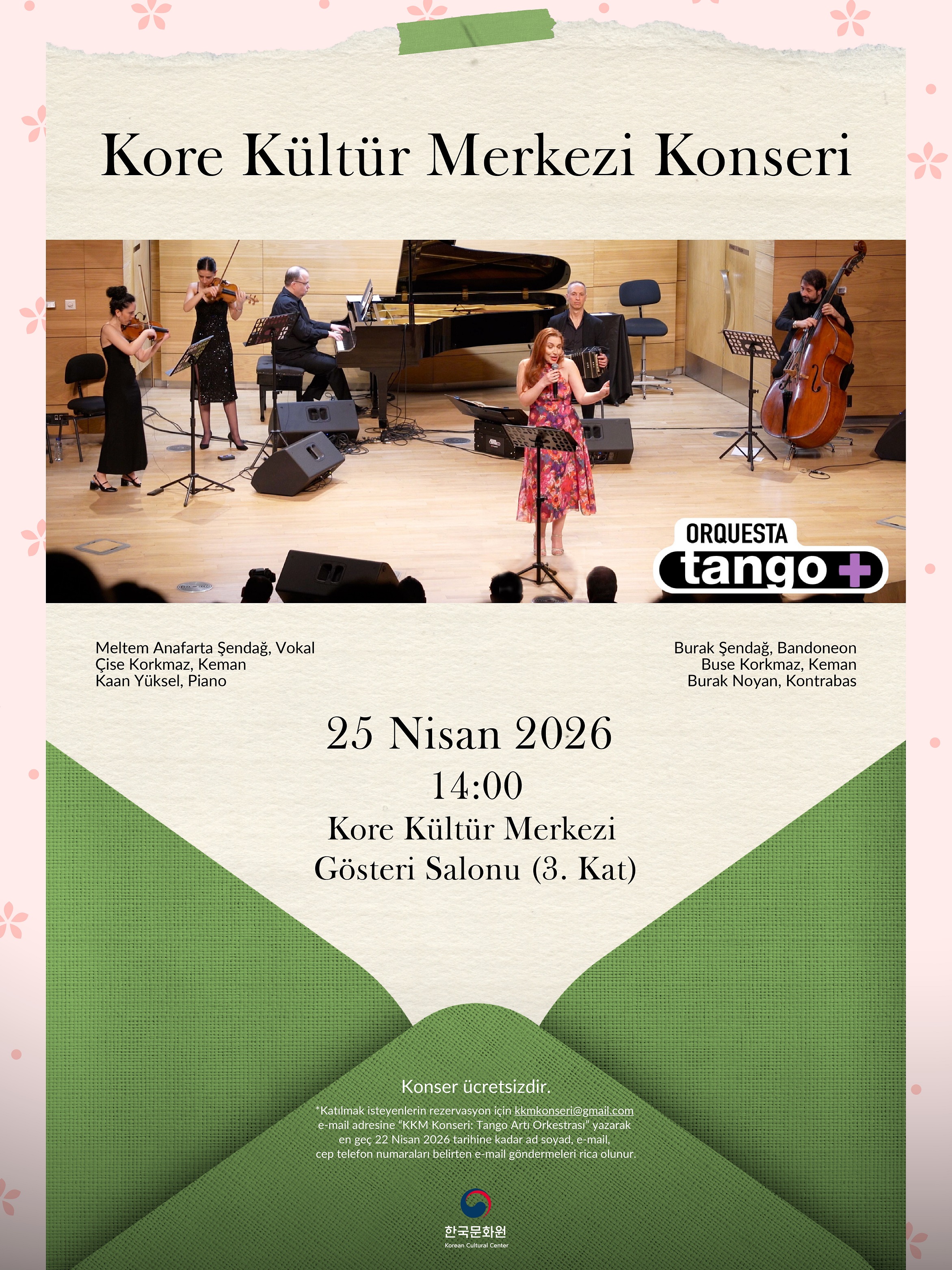 * 관람을 위해 예약을 원하시는분들께서는 kkmkonseri@gmail.com 주소로 ‘한국문화원 음악감상회: 탱고 아르트 오케스트라‘란 제목과 함께 이름, 이메일, 핸드폰 번호 등을 기입하여 2026.4.22(수)까지 보내주시면 예약이 된 분들께 회신 메일이 발송될 것입니다.