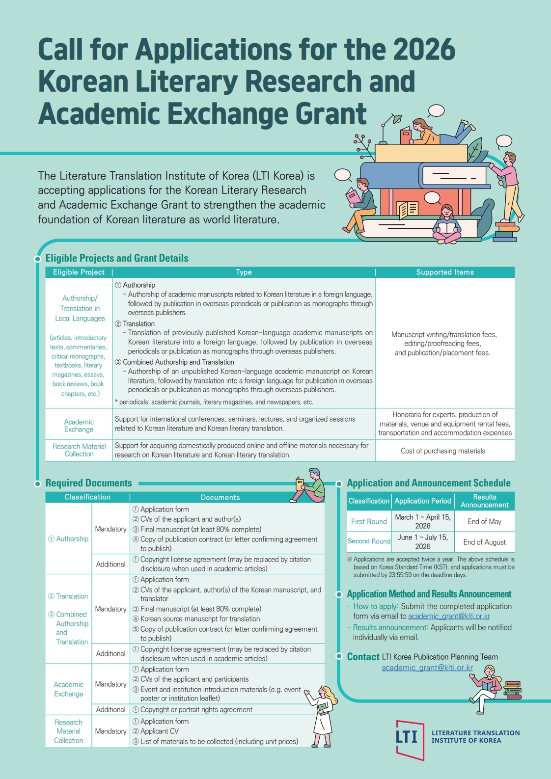 - Applications are accepted twice a year (once per half-year) ※ Application deadline: 23:59:59 (KST) on the day of the deadline ※ Projects completed before the results announcement date are not eligible Application Method: Submit the completed application for via email to academic_grant@klti.or.kr |